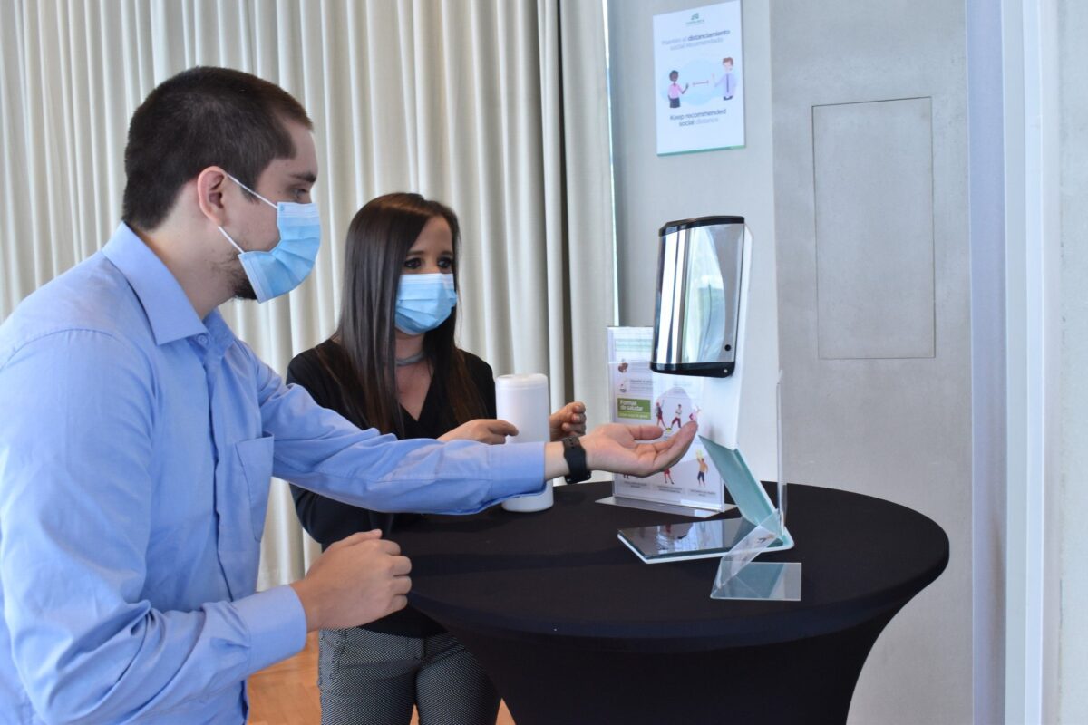 Gel alcohol dispensers have been located in strategic places (reception, food station and common areas) with their respective signs of «When to disinfect your hands?» to encourage constant hand disinfection.